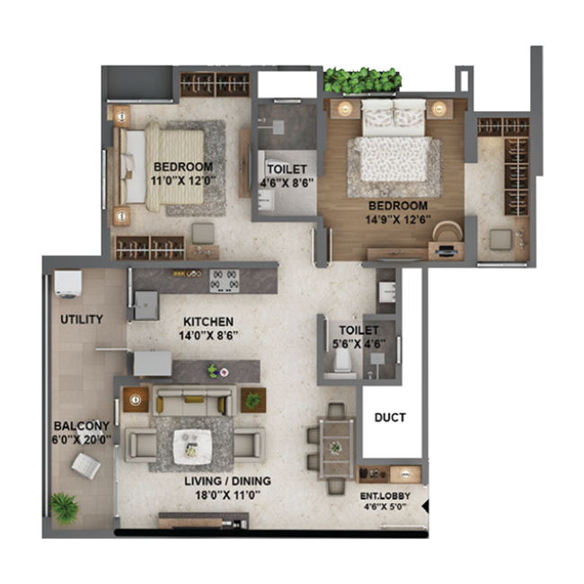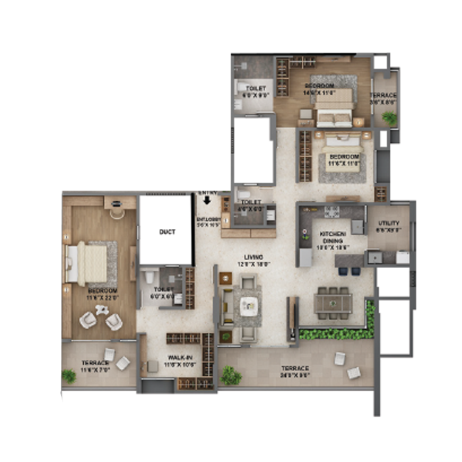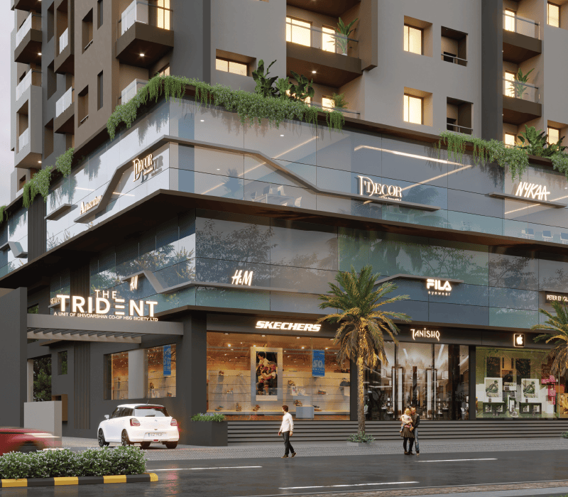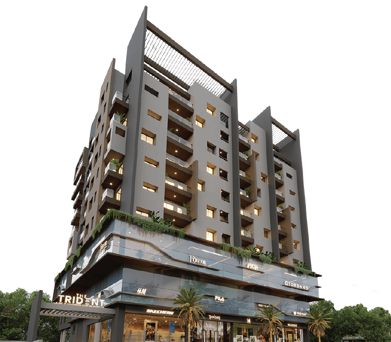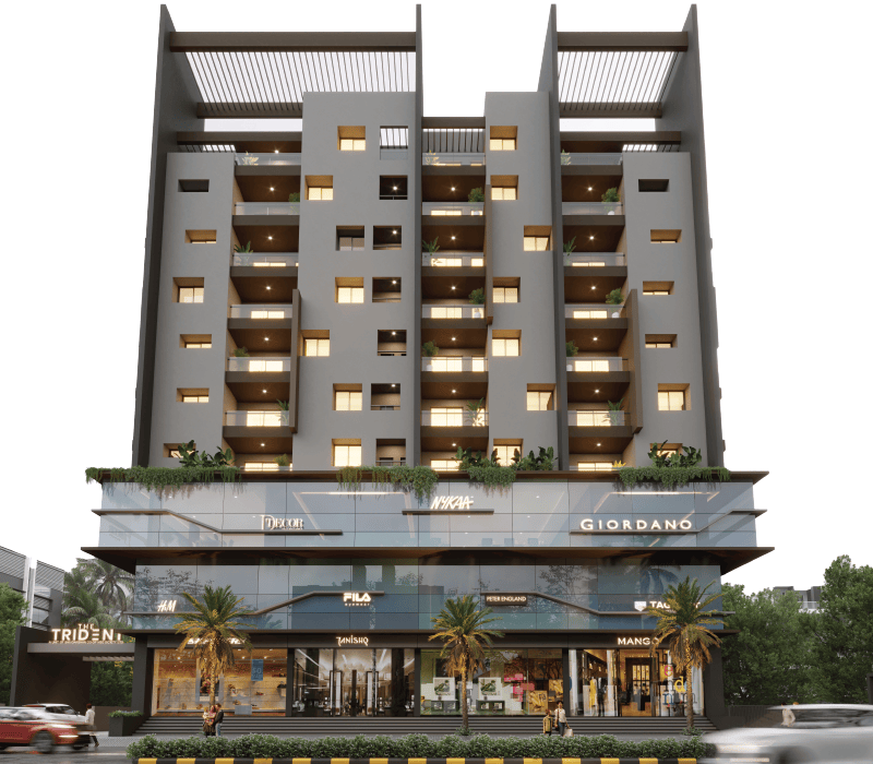 . From the access-controlled entrance to the stylish designer lobby, every detail is crafted to perfection. Ascend in a sleek auto-door elevator to homes featuring premium vitrified flooring. Enjoy evenings on a balcony with glass railings. Or exploring the landscaped courtyard podium. We offer an exclusive selection of configurations, including 2BHK and 3BHK luxury apartments, along with commercial offices and shops. Whether you're looking for a sophisticated home or a prime business space, The Trident has been meticulously designed to elevate both living and working experiences.